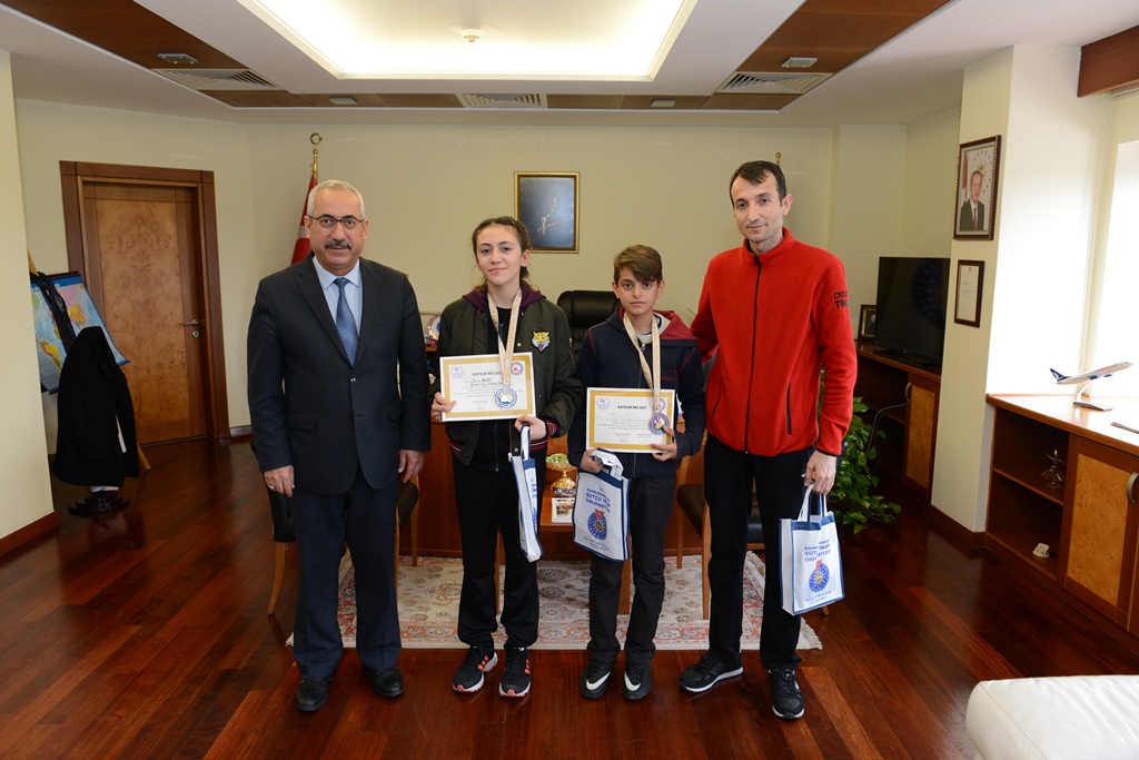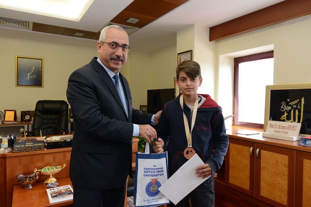 4-14 Şubat 2018 tarihleri arasında Antalya’da Şehit Muhammet Oğuz Kılıç anısına düzenlenen Türkiye Minikler, Yıldızlar, Gençler ve Büyükler Bay-Bayan Sanda ve Taolu Wushu Şampiyonasında genç bayanlar 45 kiloda Türkiye Şampiyonu olan Neris Mert, Yıldız Erkekler 35 kiloda Türkiye 3.’lüğü elde eden Semih Akpolat ve KSÜ Sosyal Yardımlaşma Spor Kulübü ve Mezunları Derneği Wushu Kungfu Takımı antrenörü Ahmet Gözükara’yı Rektörlük Makamında kabul eden Rektör Deveci, sporcuları tebrik ederek başarılar diledi.