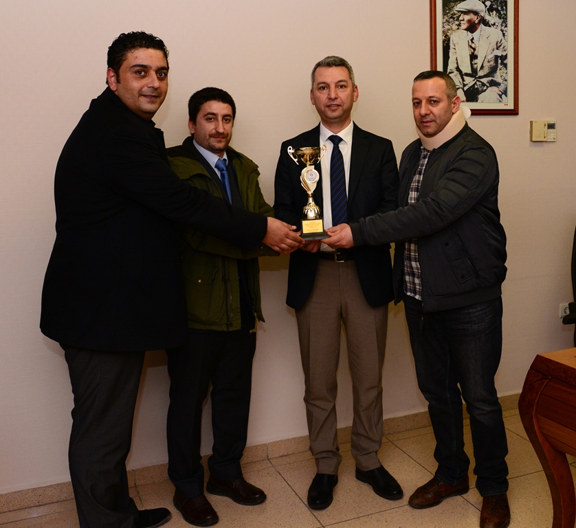 KSÜ Masa Tenisi Takımı oyuncuları Mustafa Palta, Rıza Şen, Emre Babür ve Mustafa Demir, 3.’lük kupalarını KSÜ Rektör Yardımcısı Prof. Dr. İbrahim Taner Okumuş’a takdim ettiler.