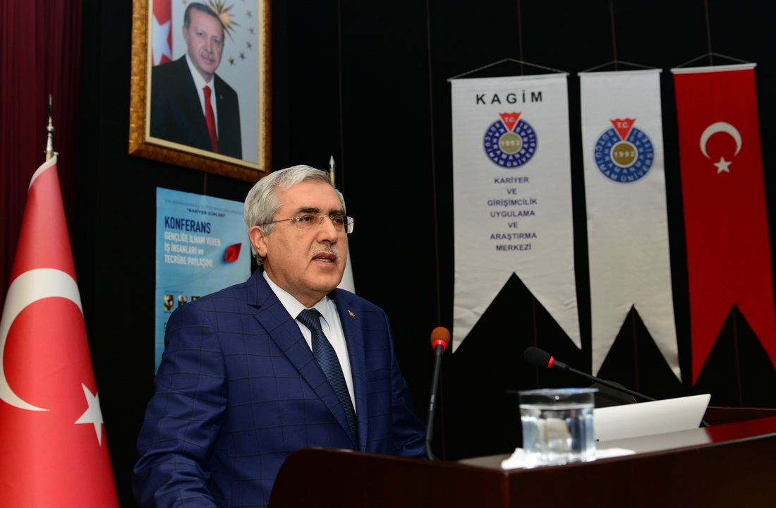 Mezuniyet öncesi öğrencilerin iş dünyasının gereklerine göre yetiştirilmelerinin gerekliliğine dikkat çeken ve KSÜ olarak iş dünyasından önemli isimlerin birikim ve tecrübelerinden yıl boyunca düzenlenen etkinlikler vasıtasıyla yararlanmaya çalıştıklarını ifade eden Rektör Can, “Biz iş dünyasının işine yarayan öğrenciler yetiştirmek zorundayız. Yoksa işe yarayan, hayata iyi hazırlayan üniversite olamayız. Türkiye’nin yetiştirdiği ve belli bir düzeye gelen siz iş insanlarının tecrübeleri, öğrencilerimizin ufkunu açan, onları göreve başlamadan hayatın kolaylık ve zorluklarını fark ettiren değerlerdir. Teorik bilgiyi, iş dünyasının tecrübeleriyle birleştirerek kaliteli insanlar yetiştirmek istiyoruz. Değişen piyasa koşullarına göre pozisyon alabilen, dijital dönüşüm bilincine ve bilgisine sahip, daha iyiyi arayan, uygulayan ve yeni anlayışlar getiren, çevresini etkileyebilen lider öğrenciler yetiştirmeye çalışıyoruz. Mezunlarımızın çalışma hayatındaki başarıları oranında üniversitemizi başarılı sayıyoruz.” şeklinde konuştu.