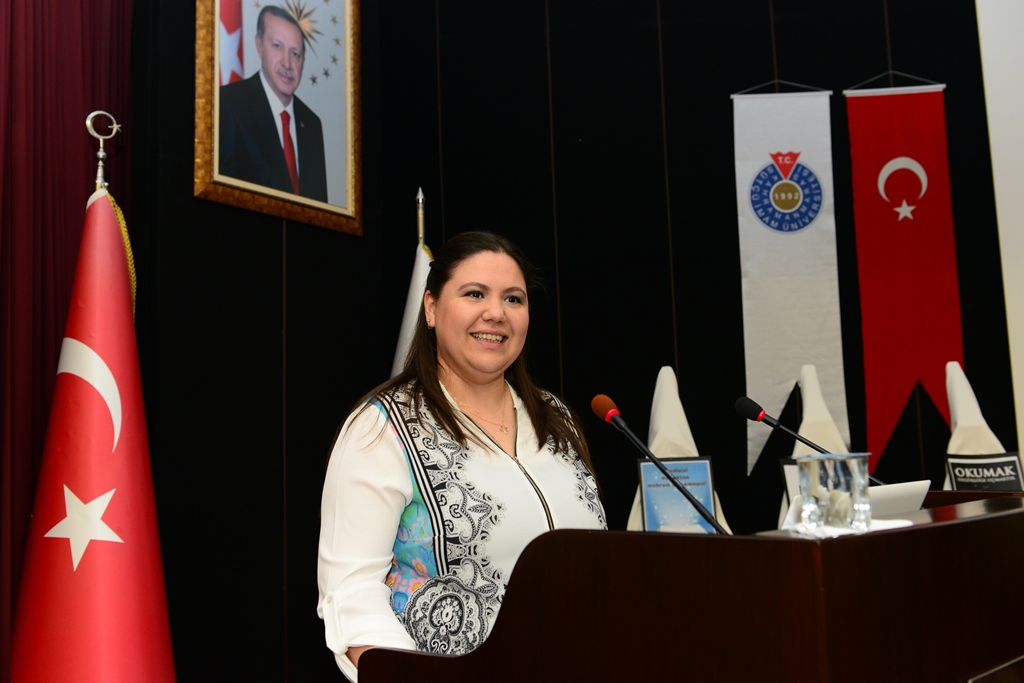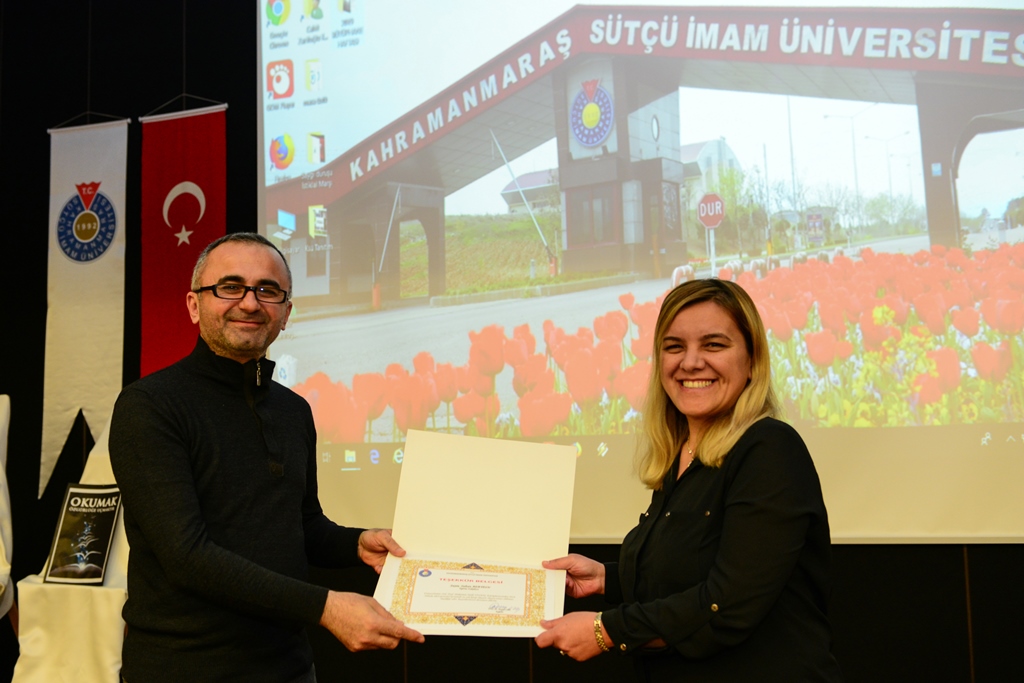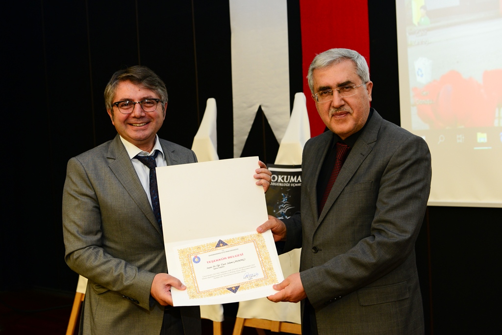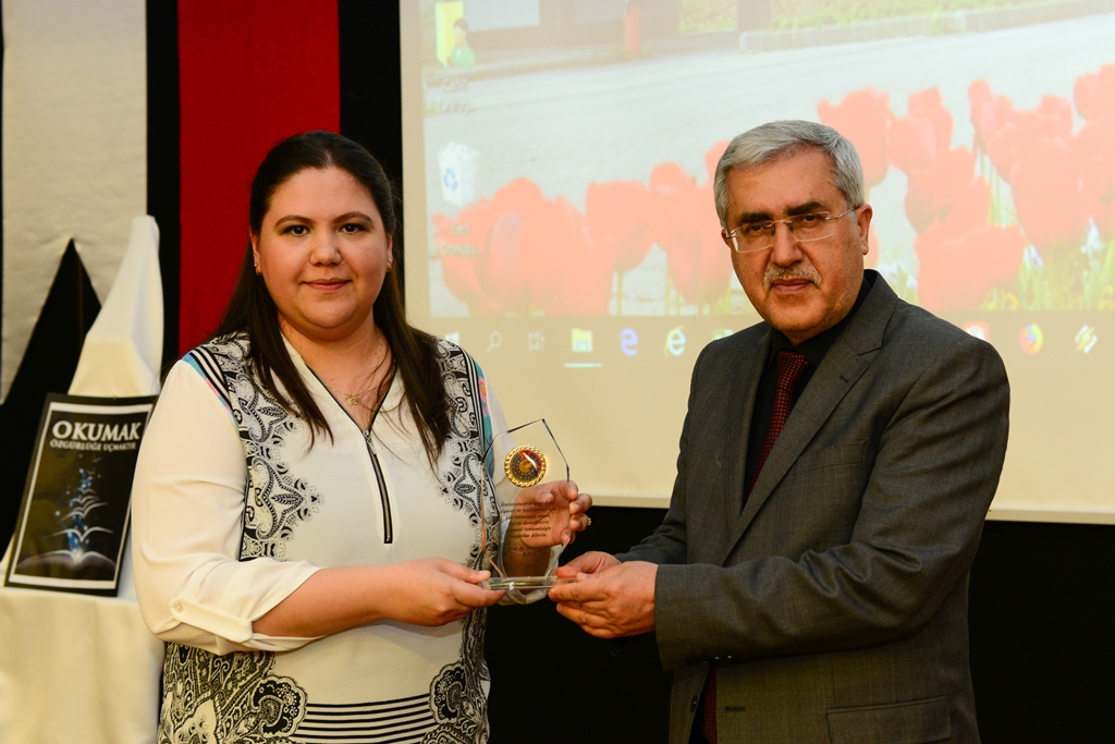 Rektör Can tarafından etkinlikte sunumlarıyla yer alan Seçil Ak ve Gökçe Değirmenci’ye plaket takdim edilirken Kütüphane ve Dokümantasyon Daire Başkanı Mehmet Bilmen tarafından da Öğr. Gör. Alper Şakalar’a hediye verildi.