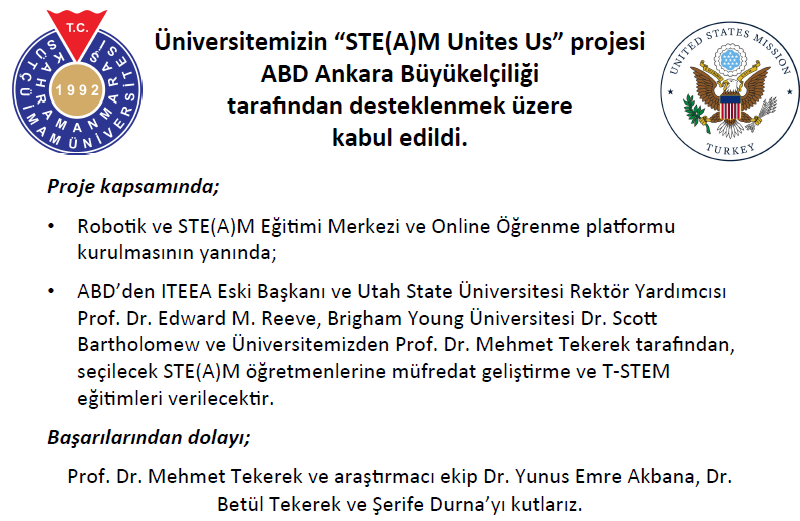 Üniversitemizin “STE(A)M Unites Us” Projesi ABD Ankara Büyükelçiliği Tarafından Desteklenmek Üzere Kabul Edildi