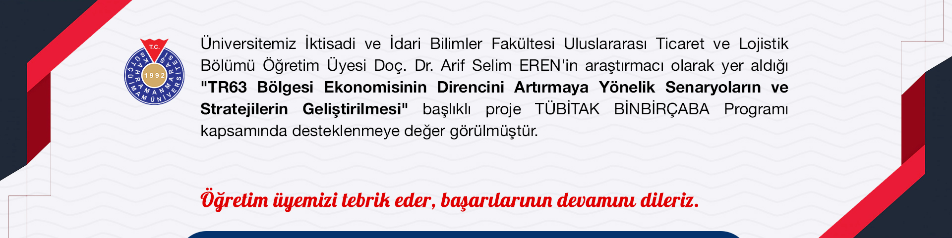 TR63 Bölgesi Ekonomisinin Direncini Artırmaya Yönelik Senaryoların ve Stratejilerin Geliştirilmesi projesi TÜBİTAK BİNBİRÇABA Programı kapsamında desteklenmeye değer görülmüştür