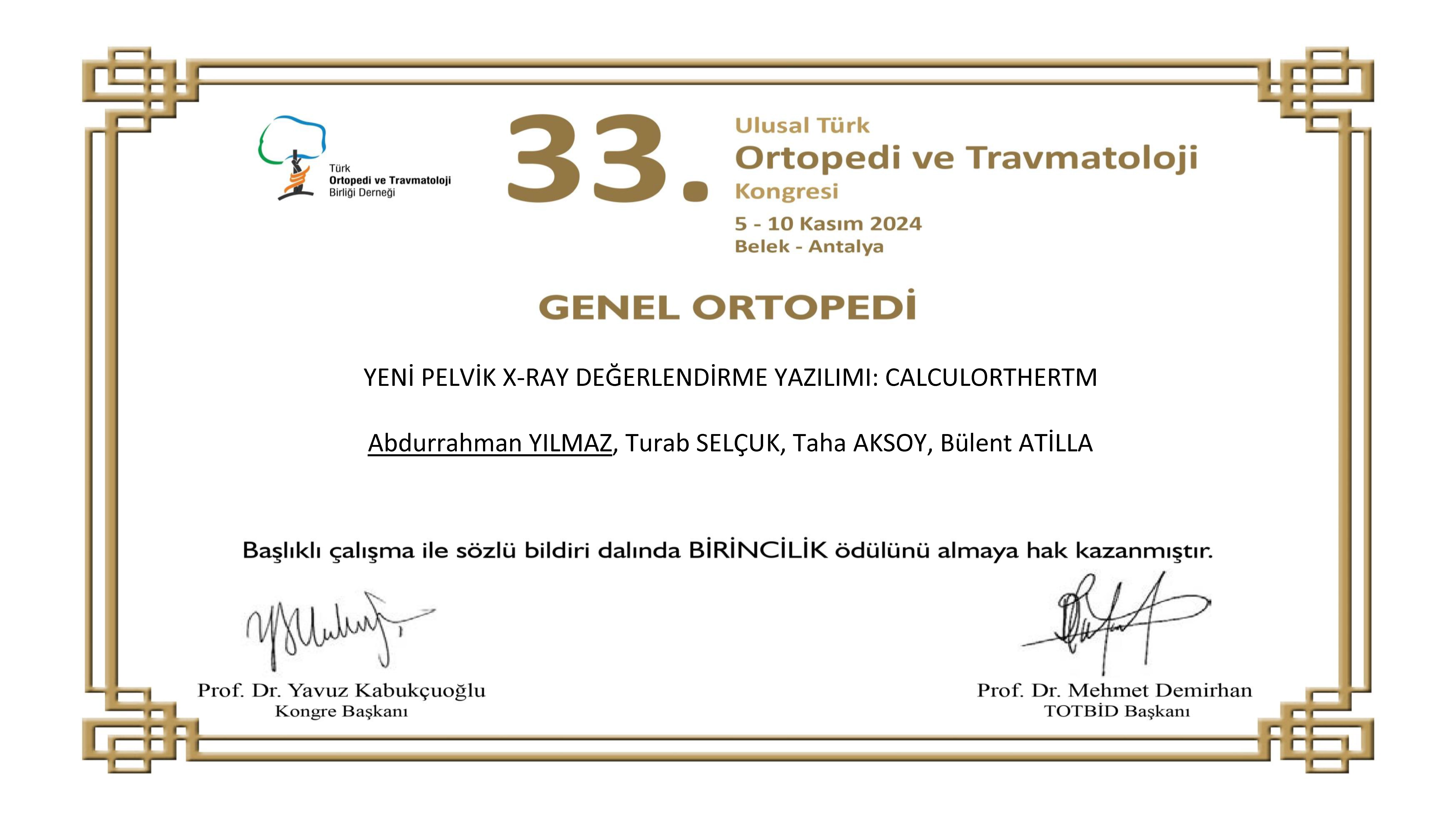 Mühendislik ve Mimarlık Fakültesi Dr. Öğr. Üyesi Turab Selçuk, YENİ PELVİK X-RAY DEĞERLENDİRME YAZILIMI: CALCULORTHERTM isimli çalışma ile Ulusal Türk Ortopedi ve Travmatoloji Kongresinde birincilik ödülü almıştır.